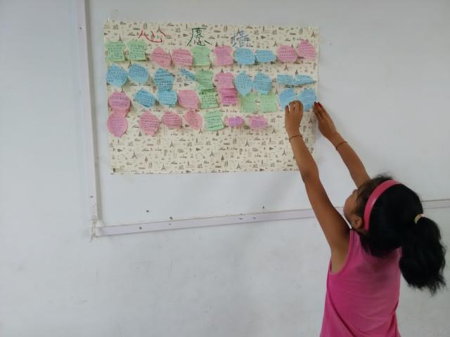 为了让田庄小学的孩子们树立积极的人生价值观、敞开心扉表达自我,大学生志愿者组织四、五、六三个年级的学生书写心愿墙。心愿墙的内容包括孩子们愿望、职业追求以及想对大学生志愿者老师们说的话。当志愿者老师们将这三个书写的内容抛给学生们的时候,学生们都怀着极大的热情跃跃欲试,他们经过一番思索,慎重地在便签纸上写下了自己的所思所想。在思考自己的愿望时,许多学生写下了“希望爸爸妈妈和爷爷奶奶身体健康”、“一家人可以幸福快乐生活在一起”等,这让志愿者老师们深受感动;写到个人的职业追求的时候,学生们都展现出了对未来的极大向往:有的学生想要成为训练有素并且肩负重任的特种兵;有的学生想要做工程师和设计师,为工程建造做出贡献;也有学生希望成为一名解惑授业的人民教师……这些都让大学生志愿者们受到了深深的震撼。另外,学生们也通过心愿墙表达了对志愿者老师们的欢心和感谢,他们表示,老师们的到来让他们的暑假更添了一份乐趣。