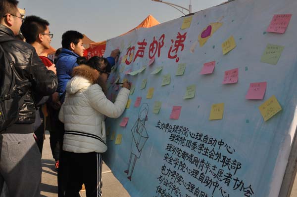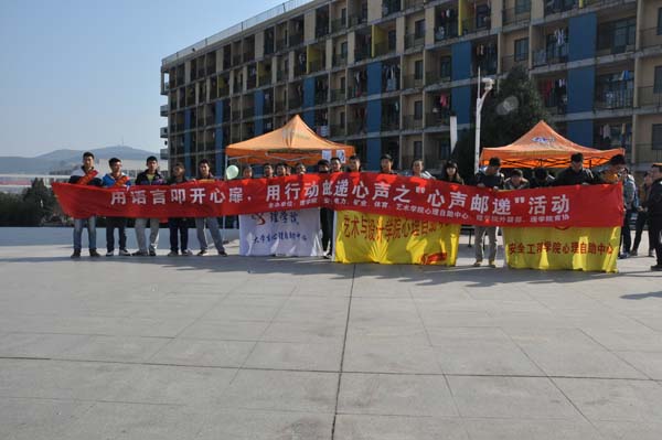 、电力学院、矿业学院、体育学院、艺术学院以及理学院心理自助中心、理学院团委学生会外联部、理学院都成刚青年志愿者协会联合主办的“心声邮递”户外活动在二食堂广场成功举行。本次活动以“人际沟通,部门宣传”为主题,旨在向同学们介绍一些实用的人际交往技巧。