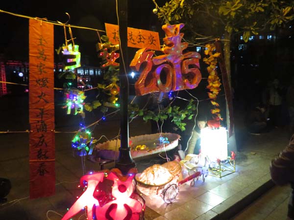 同学们精心制作的花灯正摆在二食堂广场前,一副竖挂的“安全送福”的红底对联渲染了欢快的气氛。各式各样的花朵,悬挂着的小灯笼摆放错落有致。正红色块状的“2015”“福”字样与底下的“双羊元宝车”代表了他们对新年的祝福与期望。一盏颇具古风的旋转花灯,发出着耀眼的光芒,并播放着美妙的歌声。这一切都吸引了路人的眼球,并拿出手机拍照或合影留念,热烈的节日气息使同学们忘却了寒冷。