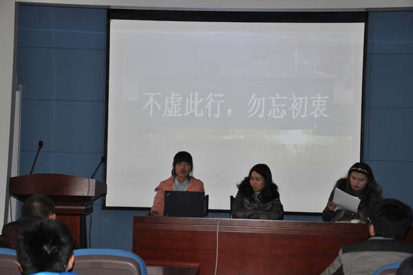 上午11时,活动正式开始。孙老师首先表示这次活动的目的是强化班委责任与服务意识,建设更加优秀班集体。随后孙老师指出期末考试即将到来,班委应该向班级同学明确考试作弊后果的严重性,积极组织诚信考试相关班会,并组织同学们在诚实考试倡议书上签名,确保每位同学都可以诚信考试。紧接着孙老师就日常管理展开讲话,她表示大学生身边存在很多不安全因素,因此同学们一定要注意个人安全,遵守学校纪律。与此同时孙老师还鼓励大家认真复习,积极备考,提高学习主动性,并且培养自己的创新意识。活动最后“不虚此行,勿忘初衷”大学生涯系列活动开幕式拉开序幕。13、14级辅导员助理分别上台介绍了大学生涯规划系列活动的目的、内容及意义。并且鼓励所有同学可以积极参与到活动中去,认真做好自己的大学生涯规划。最终活动在孙老师悉心的关怀与同学们热烈的掌声中落下帷幕。