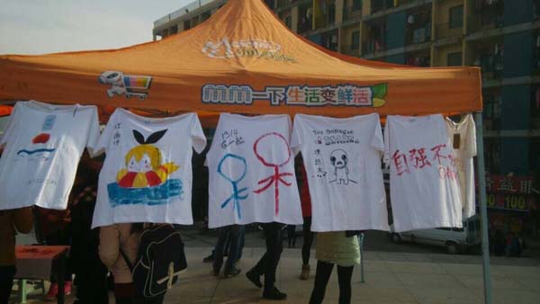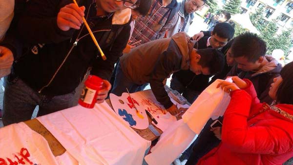 此次的系列活动共有三个,分别为“传递梦想”、“现场T-shirt涂鸦大赛”、“一年后的自己我想对你说”。当天活动刚开始,便吸引了大量的同学围观,活动现场一度达到高潮。三个活动各有千秋,而其中最具创意的“现场T-shirt涂鸦大赛”最受欢迎。有的同学单枪匹马却画功惊人;有的学姐学妹好搭档,画上自己的logal;更有情侣同心,字画互补。在二食堂广场挤满的对国际大学生节活动感兴趣的学生都不禁跃跃欲试。此外,在活动场地旁边的富有创意的T-shirt也别具一格,展现了同学们一颗颗富有创造力、敢于追求的心。