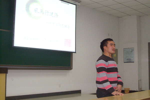 晚上7点,讲座在主持人朱�株的开场白中拉开帷幕。在主持人对现场嘉宾做了一个简短的介绍之后,李成刚老师就本次活动旨在让同学们同身边的榜样学习,树立正确的学习观,人生观做了简短的解说,并对主讲嘉宾表示感谢。随后,讲座正式开始。首先发言的是来自四川泸州的张栩,她从小患有小儿麻痹症,上帝没有给她一个强健的体魄,但却给了她一颗坚强的内心,从小开始,在父母的教育下,她一直保持着积极乐观的态度,认真对待人生中的点点滴滴,虽然只是大一新生,但却已经通过自己不懈的努力荣获了校内外的多项殊荣,她乐观的心态和强大的内心给现场的每一位同学都留下了深刻的印象。随后出场的来自地质09-4班的温佳在大学三年的生活中,依靠勤工助学解决个人的生活问题,虽出身贫寒,但学习却十分刻苦,先后获得“国家奖学金”和“国家励志奖学金”,其“滴水之恩当涌泉相报”的人生格言感动了每一位听众。随后发表演说的赵媛媛和赵亚芝对父母的那份深深的感恩之情打动了现场的每一位听众,他们用自己的行动,以优异的成绩和突出的表现回报了自己的父母,也成就了自己。晚上九点十分,本次励志讲座圆满结束。