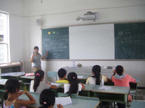 志愿者们在之前与孩子们的沟通中发现,虽然当地小学从三年级开始安排了英语课,但由于教学资源及交流氛围的缺失,孩子们的英语水平远远不如同年级的城市学生。为了弥补这个方面的不足,下午三点,课程准时开始。首先,谭佳昕先教了同学们一系列的水果英文单词,她在黑板上写一个单词,告诉同学们意思,并请小朋友举手上台画出这个水果,同学们都十分踊跃积极举手,气氛活跃。画好之后,谭佳昕开始教单词发音,她读一遍,同学们跟着读一遍,当小朋友不能准确的发出音时,她就一遍遍的示范,让同学们注意自己的嘴型,耐心地纠正。