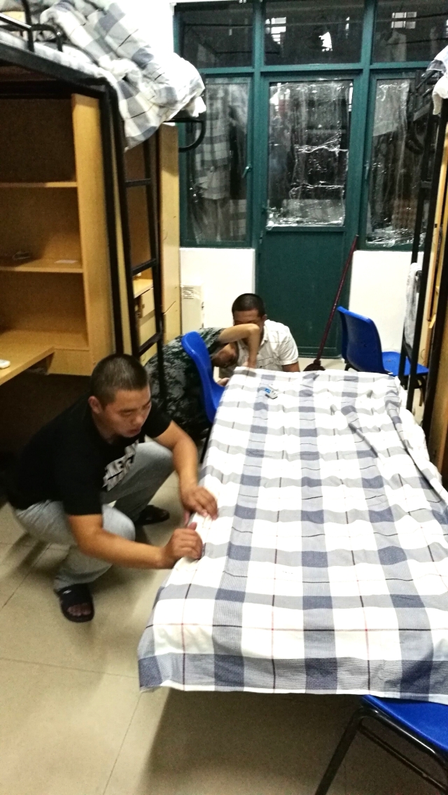 各个宿舍长在宿舍走廊集合,学习如何订床板。团委学生会负责人详细的示范了如何钉床板,各个小寝的宿舍长负责学习。负责人首先先将床单的一侧用钉子密密钉好,再将褥子放在床板上,尽量铺放整齐,最后将床单的另外三侧钉好。各寝室的宿舍长,目不转睛地看着学生会的示范,并不时地在记录本上记录各种细节,生怕有所遗漏,耽误自己的宿舍的内务进度。