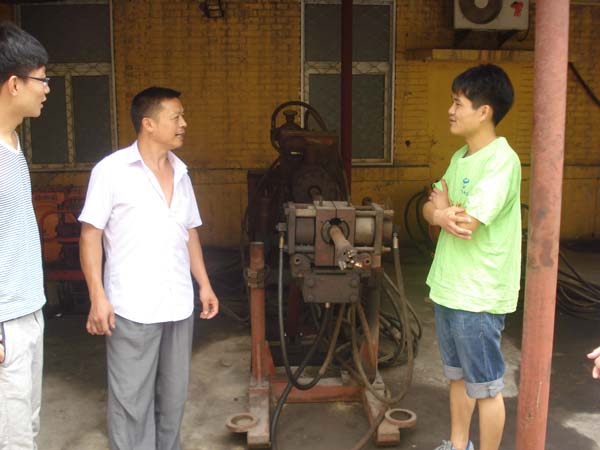 队长张鑫也跃跃欲试,他主动要求尝试对钻机进行操作,虽然刚开始接触机器有点手忙脚乱,但是经过一阵练习之后,他已经能够使用钻机进行一些的推进和旋转作业。下午四时许,本次实践活动也在实践团队员们与赵叔叔欢快的交谈中圆满结束。