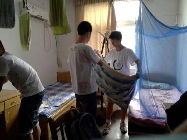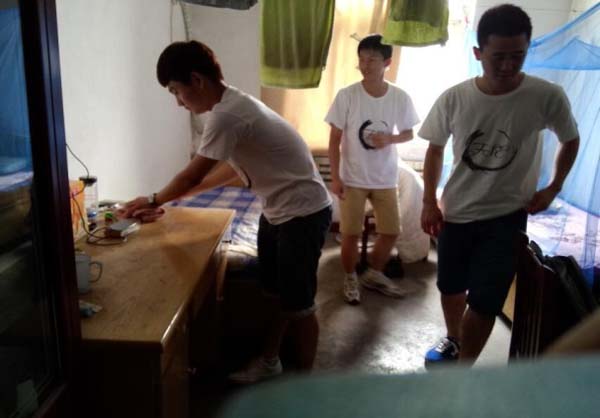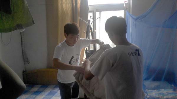 团队成员了解到,下井的一线工人一般在井下加上清理及准备时间需要10多个小时,而在这10个小时中,由于体力消耗大,致使他们在休息时间没有多余体力去打扫宿舍,所以当团队了解这一情况后,队长王迪主动向矿上领导要求为职工打扫宿舍,为了不打扰矿工休息,团队成员和矿上领导协商之后,领导们安排实践团队在7月22日上午为部分年老的矿工打扫宿舍卫生。