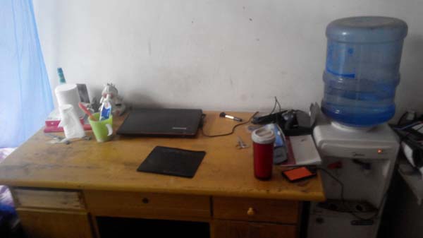 煤矿分为黑白两个班次,所以白天宿舍楼很少能看见员工的踪迹。队员们顺着楼梯往上爬行,偶尔也可以听见几处电视机的嘈杂声,区长告诉我们:煤矿上的生活虽然有些枯燥,但是倒也不至于索然无味,矿工在繁忙的工作以后还是会有一些娱乐自己的设施和方法。在宿舍楼的四楼是矿大毕业的在矿上工作的一位毕业生的宿舍。宿舍内生活器具应有尽有,包括空调,电视机,饮水器,电脑……这些常用电器在这里一应俱全,可以看出来煤矿对员工的日常生活是十分在意的。而整个煤矿的周围是一个静谧的村庄,祥和宁静的生活环境给了旷工们无穷的工作动力。