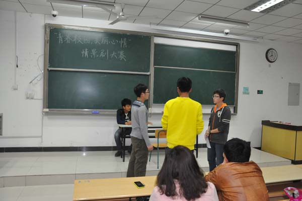 心理自助中心举办的“青春校园,美丽心情”情景剧大赛在教三A201举行,12级和13级共8支队伍参加了本次比赛,本次比赛邀请了辅导员蔡维维和杨洋老师担任本次比赛的评委,由童天润同学担任比赛的主持。