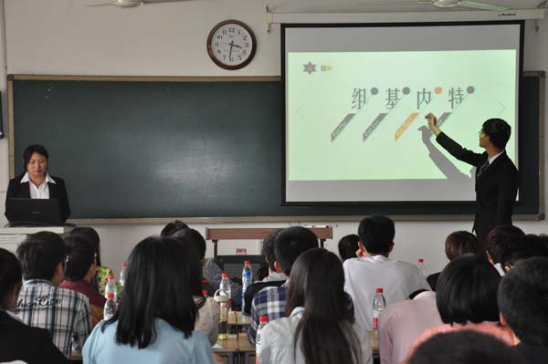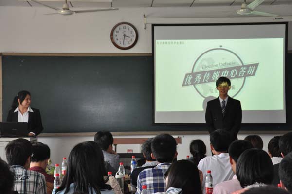 新闻宣传中心主任谢振万以及部长陶冰冰作为助手登上讲台开始他们的答辩。谢振万首先介绍了安全新闻宣传中心的组成等基本信息,再以“组、基、内、特”四个字总结答辩的四部分并分条介绍。之后向评委汇报了这一学年的工作成果,比如向院网、校新闻网投稿四百余篇,向校外媒体投稿约四百篇等成绩。接着,他着重介绍了安宣的板报、海报工作成果,虽然安宣负责海报的仅五人,但在这一学年里,他们五个人却完成了14张橱窗,125张海报。对于新部员,安宣的部长会悉心照顾,组织多次培训,并加强情感建设,举行集体春游。再是介绍了安宣的三个SNS平台,充分利用微博,人人这些热门社交软件来宣传组织工作。最后,他总结说:虽然安全新闻宣传中心只有18人,但他们会一直践行“以最少的人做最好的宣传”这一理念,朝着“多元化”、“特色化”的方向发展。在主任谢振万结束报告后,校包子漫画评委就安报发行量和发放对象对他及安宣部长陶冰冰提问。他们细致地回答了问题。