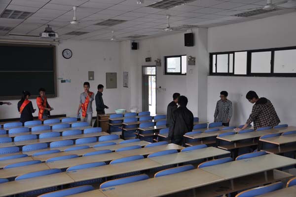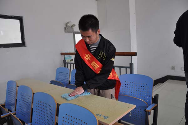 负责的区域为第一教学楼的一楼和二楼。为提高工作效率青协部长祁钰对任务进行了精心的组织与安排,清扫工作有条不紊地展开。青协部员这边,房龄航快速的打水,涮抹布,鲁守正认真地擦洗桌子。讲桌黑板也都擦洗的一尘不染。安全12-2班也认真地完成了他们负责的任务,他们把桌子里面的垃圾都清理干净。2班的团支书苑芳同学擦桌子尤为细致,桌面变得光洁如新。经过认真的打扫,教室被打扫得干干净净。三点半,活动准时结束。