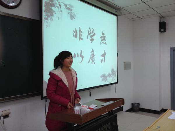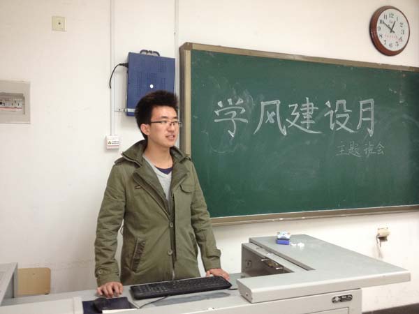 班会开始,首先主持人王仕坦在水墨风格的PPT播放中介绍了学风建设月“集体自习与英语月” 、“课堂缺勤与晚自习考核” 、“学校学风建设意见征集“三项主要活动。随后本班的付艳晴同学与大家进行了学习方面的交流,作为专业成绩第一名,国家奖学金,平江电气奖学金,瓦斯好学奖学金获得者,她讲述了她去年的成功经历和在大二新学期了遭遇的困难与困惑。并决定在考试周前组织集体自习,以期共同学习,共同进步。接着是学习委员金自豪报告本班学习状况,并提出了建立学习交流平台的意见,并总结了本班的现状和过去的所取得的成绩和不足,并就此向大家提出未来的学习计划。最后在学习委员的带领下全班同学在学习宣誓书上签字,以此来表达自己在接下来的日子里努力学习的决心。