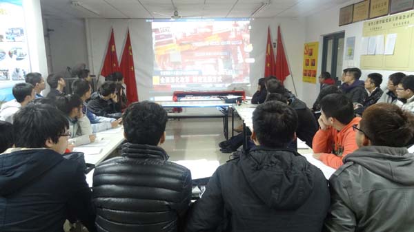 党员工作站站长李先赞和团委学生会知行社社长彭扬的主持下,安全全体党员、知行社社员以及大一各班团支部书记共同参与的十八届三中全会的学习研讨会。