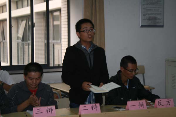 晚上七点整,辩论赛拉开序幕。本次辩论赛的辩题是“青春偶像崇拜”,正方是安全13-2班,反方则是安全13-3班。首先,主席向双方辩手传达“友谊第一,比赛第二”的竞赛理念,并宣布辩论赛正式开始,进入第一个环节――阐述各方观点。正方一辩率先站起,表明他们的观点是“青春偶像崇拜利大于弊”,他用沉稳的姿态、流利的表达和丰富的例证向在场的各位清楚地传达了正方的观点。随后反方一辩就他们的观点“青春偶像崇拜弊大于利”深入剖析,由针砭偶像崇拜的弊端不断升华,进而引发对社会青年盲目跟风、一味追求个性的鞭挞。反方一辩利落果断,缜密的逻辑和严谨的辩词透露出她的沉着淡定,出色的表现更是赢得了现场的热烈掌声。接着,主席宣布进入辩论赛第二轮――正反方辩驳立论。辩论赛一下子激烈起来,双方辩手互不相让,正方辩手始终抓着偶像崇拜的益处进行辩驳,反方辩手毫不示弱,提出应追求人文和创新,而不是盲目崇拜。紧接着,进入最为激烈的第三轮――自由辩论。辩论赛渐渐转变成正方一辩和反方二辩的“战场”。两人唇枪舌剑,不断切磋,把辩论赛现场的气氛推向了高潮。随后是第四轮――总结陈词。双方辩手均在最后做出了强有力的一击,再次概括强调了己方观点。最后,评委在听取了双方的阐述与辩论后,经过慎重的考虑,宣布本场辩论赛获胜的是反方三班,最佳辩手则是二班一辩。