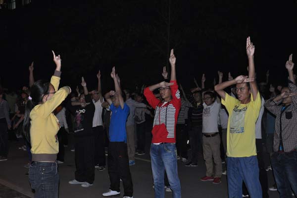 13级新生在体育部部长们的带领下冒着寒秋的些许凉意齐聚在第三运动场,同学们在各位部长的指导下迅速地站好了队伍,他们的身上仿佛映射出军人般的英气。随着领操员的口令响起,同学们眼神齐聚领操员,跟着节拍,照着领操员的动作一丝不苟的模仿着,其间偶有同学动作不规范或有疑问的地方,领操员都仔细耐心地一一讲解示范,经过同学们和每位部长的共同努力,趣味广播体操的培训工作已取得初步的成效。一排排横竖分明的站队,一个个整齐划一的动作,无不昭示着安全学子朝气蓬勃的生气,乘风破浪的豪气,以及全院团结一心的凝聚力。