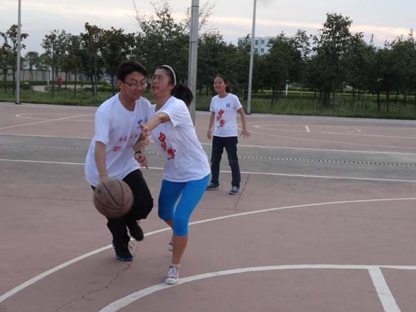 由于有参赛队员五人加职工一人,梦之队分成了以副队长付艳晴为代表的蓝队和以队长朱瑜为代表的白队进行三对三的篮球比赛。比赛一开始开始,球场上,你来我往,大家精神奕奕,各施绝技,精彩画面层出不穷,欢乐笑声不绝于耳。在第二局进行到一半时,白队强防周雯以娇小的身姿和绝对的弹跳力,一举拿下丁威的投球,让比赛进入到又一个高潮。在白队的强烈攻势下,第二局以白队常叔叔投进一球追回比分结束。由于上一局白队有针对性的猛烈攻势,蓝队决定调整战略。