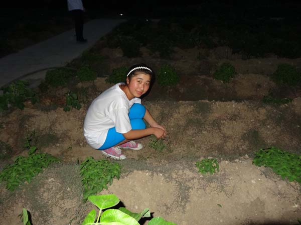 生态园内,一排排的农作物显得生机盎然。刚一进入生态园,队员们便摩拳擦掌,跃跃欲试了,大家纷纷拿起工具,走进田地,开始劳作。有人浇水、有人除草、有人摘菜……夜幕渐渐降临,但田园间依旧可见穿着印有“中国梦”红色字样的一群大学生在田地里劳作,周围蚊子也时不时过来凑个热闹,肌肉的酸痛让人难以忍受。但是,队员们依旧合作无间,他们还是不厌其烦的扯着水管给田地浇水,蹲下来除草,帮忙摘菜,握着铁锨松土……