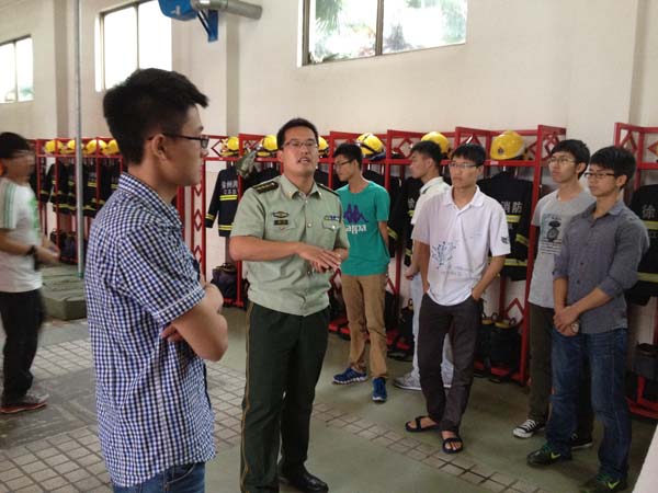下午1时许,天空中下起了瓢泼大雨,但是恶劣的天气丝毫没有对同学们参观消防队的热情产生任何影响。青协的志愿者们到达消防队之后,首先给官兵们送去提前准备好的水果,表达了同学们对于消防官兵们深深的敬意。稍后,消防队的官兵们为同学们详细的讲解了消防车的构成和部分灭火仪器的使用情况并进行了一分钟出警演示(队员们顺杆从二楼滑下),同时同学们得到了难得的体验爬杆机会。随后,消防队员们又对消防衣进行了展示和消防衣11件的讲解,同学们在听完介绍之后也纷纷穿上了消防衣进行体验。活动的最后,同学们参观了消防队员的宿舍,并和官兵们进行了叠被子的比赛,在同学们和官兵们的欢声笑语中,此次活动也画上了圆满的句号。青协的一位志愿者在活动之后说,参加这样的活动让自己学到很多东西,不仅丰富了课余的生活更让自己对消防队有了更好的了解。