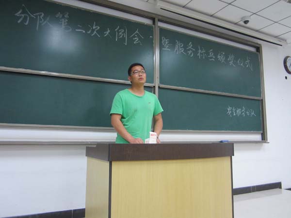 团委副书记张鹏飞颁发。主席在一边颁发奖状时一边鼓励获奖人员“继续努力”。此后,优秀小组长代表文相飞与大家分享了自己的获奖感言。最后,主席张鹏飞总结了以上等人讲话,对分队一年来的奋斗与成果做出了十分的肯定。除此之外,他还鼓励大家抓住大学里的机会,每个人都会做的更好。此后,大会在一阵阵掌声中落下帷幕。
