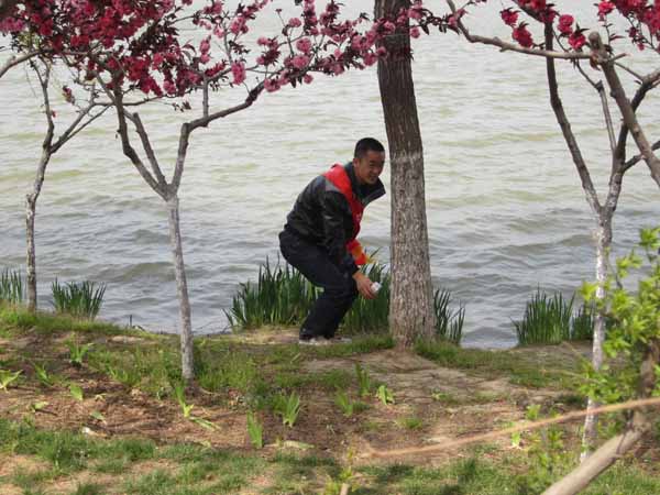 上午九点二十分,学院服务分队D组成员以及校服务总队的考核人员准时来到了校北门集合,在D组组长蒲万奇的带领下,乘坐公交车来到了位于云龙湖南的小南湖公园,并在九点半到十点半的一个小时内对小南湖公园周边草坪和湖边的垃圾进行了清理。因为时间恰好是周六,来到小南湖游玩的市民的数量较平时有很大的增长,又因市第一幼儿园的老师带着小朋友们来此春游,给公园环卫工人们的清扫工作增加了很大的压力。
