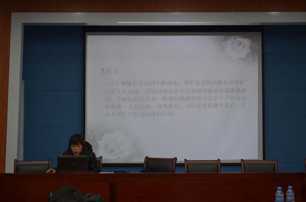 最后,蒋文杰硕士带来了题为“大安山矿煤岩冲击破坏电磁前兆特征及预警研究”的报告。他主要依据大安山矿轴7槽的回采工作面在采动过程中电磁辐射信号来分析回采面应力分布情况,他认为需要对动力灾害情况的进行提前预警,通过采取必要措施来阻止灾害的发生。