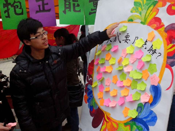 本次活动由两部分组成,一个是要求参与者用纸片写下自己希望几点睡,同时说出自己对该活动的看法。这个活动就是让同学们敞开心扉,用自己高亮的声音将自己的想法喊出来。这样不但能使大家更加深入的思考这个活动的意义,同时也能分享不同的看法,实现信息的交流。事实上,“世界睡眠日”并不只是让自己好好睡觉,更重要的是自己养成良好的作息时间,做到健康睡眠,既要保证休息,又要保证工作和学习。有人说,身体使革命的本钱。现在虽然不用再去做革命这样艰苦的事情,但每个人都应该有一个良好的身体。只有这样才能有精力和体力实现自己的目标理想。这个部分收到了极大的关注,用来贴纸片的展板在活动开始时就迅速被贴满了。