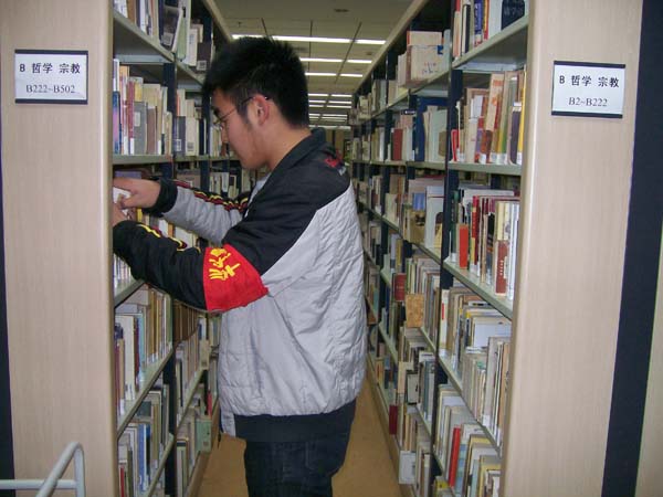 学生服务分队“图书馆共建”活动开展以来,每周的周一、周二晚上都会有分队队员到图书馆进行服务活动,比如将书籍摆放整齐,清理书架上的灰尘等。这些活动看似简单,操作起来却很累人。整理书架时一不小心就会出现失误,同时由于书的量很大,在检查时也有一定的困难,队员们经常得在一个书架上花很多时间仔细查找,以避免出现"返工"现象。活动一直到九点半才结束。