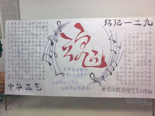 本次展板展示活动作为纪念“一二九”系列活动中的一项,在展板内容和板式上充分的贴近了当代大学生生活。展板中央极富艺术气息的红色的“魂”字,不仅带给人强烈的视觉冲击,同时也揭示了一二・九运动的深刻内涵,即那些为了挽救国家和民族奋不顾身的青年学生们身上折射出的中国魂。紧邻的一首诗将同学们的思绪带回到七十七年前的那场运动当中,表达了对烈士们的怀念与敬仰。除此之外,展板还展出了一二・九运动的历史背景和详细过程,便于同学们更深入地了解此次运动,也有利于同学们对爱国精神有更加深刻的体会。展板以独特的版面、精彩的语言,吸引了许多路过的同学驻足观看。