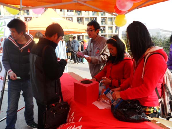 临近中午时,各院在广场上布置好了各自的活动场所,并竖起了宣传展板。来往的学生络绎不绝,很多人都停下了脚步参与和体会这一充满了爱心和温暖的活动。各院的宣传人员散布在广场上,或是为路过的学生讲解知识,或是邀请他们参加知识问答等活动。