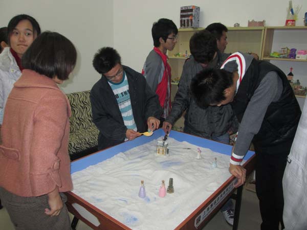 讲解员首先在心理咨询室给同学讲解了心理咨询的工作与意义,之后他带领同学们参观了心理观察室,同学们对观察室中的可透视玻璃产生兴趣,玻璃在灯光下无法看到另一面的情况,却可以在暗室中看到对面。据讲解员解释,这样可以有助于专家了解学生心理而不至于使学生过于紧张。之后同学们参观了心理剧治疗室、沙盘治疗室。沙盘治疗室中有许多教师以及同学做的模型,心理咨询教师可以根据学生在沙盘上排的模型来判断学生心理。参观的同学对那些漂亮的模型非常感兴趣,他们说有种童年的感觉。然后同学们参观了矿山环境模拟心理训练室,同学们对其中的暗色装饰感到迷惑,讲解员解释这是为了模拟出矿井下的情况特别开创的一个心理教室。然后同学们请求体验音乐治疗室,其中的音乐软件可以自动调整,可以使人感到很放松。但由于当时老师并不在,所以同学们没有体验成功,而讲解员提醒如果想要体验或想要心理咨询,必须提前预约。最后,讲解员带同学们体验了拳击发泄器。