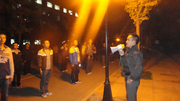 当天晚上9:15左右,参加训练的11级和12级学生已经在体育部的指挥下整理好队伍。随后,辅导员李成刚老师到达训练现场,视察了整个训练过程。