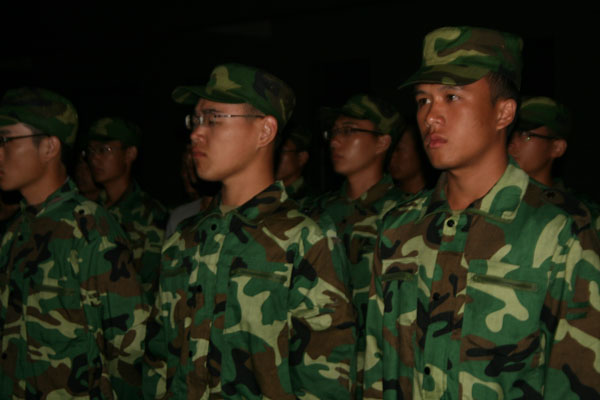 12级新生军训加强排早早来到运动场,在负责人的带领下进行训练。他们对自己在训练中暴露出的问题进行了总结,并商量解决的方法。同时,他们针对自己做的不好的科目进行了强化训练。白天的训练已让他们精疲力竭,但他们的热情丝毫不减。在黑暗的田径场上,他们的口号声格外嘹亮。