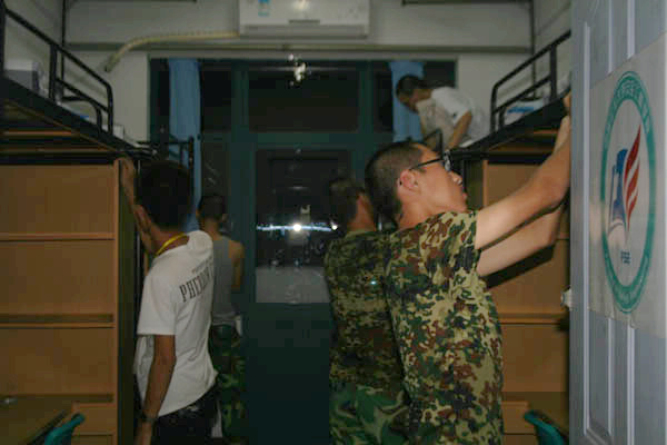12级新生在军训中将自己当做军人,积极学习着怎样做一个合格的军人,他们对自己的严格要求将促进他们早日成为一个合格的大学生。虽然,新生们经过一整天高强度的军事训练课程早已疲惫不堪,但他们对宿舍内务打扫仍然不敢有丝毫的懈怠。对照军训内务评比的具体要求,新生们在打扫时逐一对照落实,分工合作,在劳动成体会军训的乐趣。夜晚十点半,经过师生们的共同努力,新生宿舍里窗明几净,地板砖光亮整洁,墙壁白亮如新,有棱有角的“豆腐块”被子更显同学们的认真与用心。虽然大家来自五湖四海,但在学院荣誉的感召下,同学们不仅创造了洁净的宿舍环境,也在这样的集体努力中迅速建立了信任与情意。