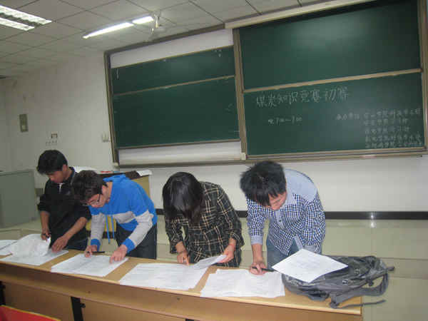 本次煤炭知识竞赛分为初赛笔试和复赛现场竞答两部分,在3月31号开始报名之后,得到了全校同学的广泛响应。4月8日晚上6点50分,参加初赛的同学们都已提前进入了笔试的考场,有序地就坐。监考人员开始分发试卷,7点钟,考试正式开始。考场中,同学们都表现出了良好的考风考纪,加之考试题目均来源于题库,有了一定准备的考生们都表现的得心应手。考试持续了一个小时,八点整,监考老师开始收试卷。从考生们考完后的讨论中得知,考试内容与题库中的题目出入不大,大部分题目都能很顺利地解答出来,但个别题目略有难度,需要考生思考后根据个人见解作出解答。