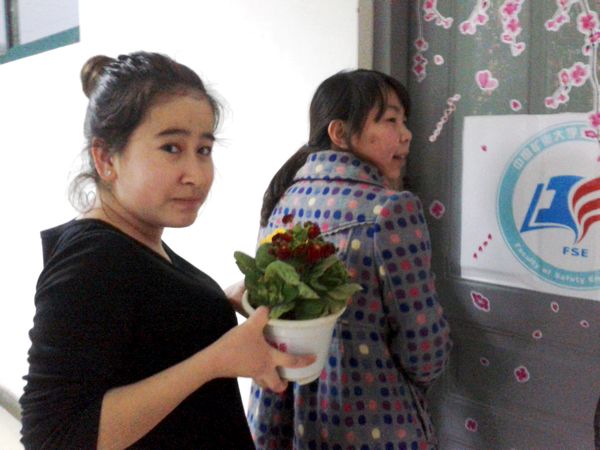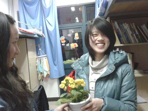 女生迎来了节日里的第一份浪漫惊喜。门一打开,出现的是,手捧鲜花、笑容灿烂的女生部男干事们。他们亲手将鲜花送给每个女生,并亲切地祝福她们节日快乐。接着女生部的干事们纷纷将对女生们的祝福写在准备好的彩色气球上,并用这些气球精心装饰了每个女生宿舍,希望将这份祝福传递给每一位女生,同时也祝愿女生们在属于自己的节日里过得更加愉快而充满意义,使她们在繁忙的学习生活中获得一份温暖与关怀。接收到祝福和礼物的女生也微笑着向他们表示了感谢。