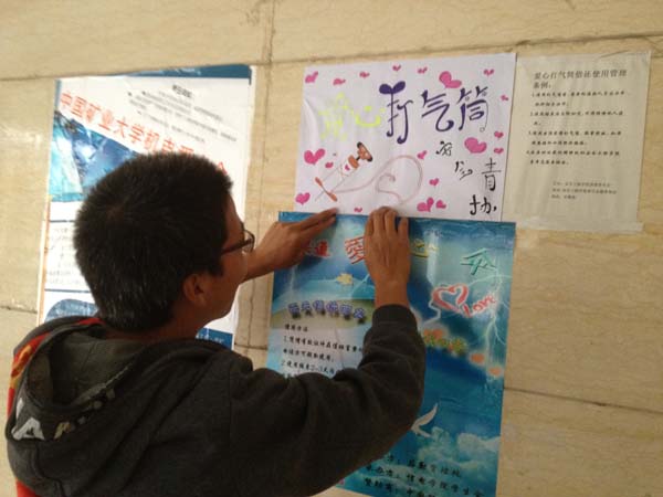 自2010年首次举办“爱心打气筒”捐赠活动以来,安全青协的活动受到了广大师生的一致好评。但随着时间的推移,绝大多数宣传海报已经褪色甚至丢失,同学们根本无从了解爱心打气筒的存在。本着服务同学、奉献爱心的原则,安全青协全体成员就此问题进行了讨论,并决定举办本次的“爱心打气筒”维护活动。在征得学校相关部门同意后,安全青协进行了积极的准备,并组织人员制作了相关宣传海报。下午两点,青年志愿者协会的同学们分成五组,分别在五个公教区进行维护活动,最终于三点完成全部维护事宜。据悉,本次活动开始后,包子漫画
