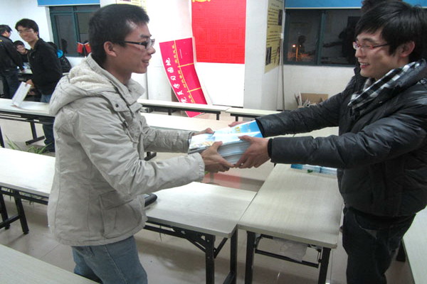 党员工作站牵手“精英教材”,为同学们送上免费复习资料,党员工作站副站长涂庆毅、“精英资料”负责人赵泽旭及09级各班班长、学习委员参加了本次活动。