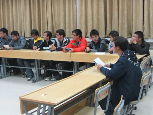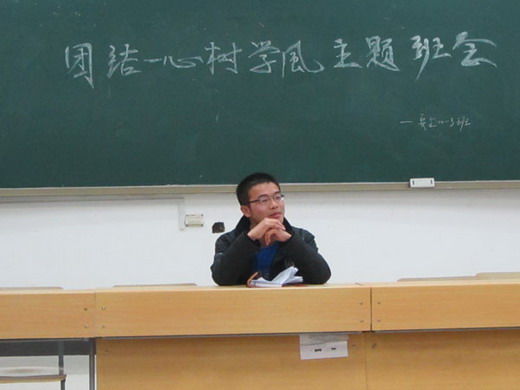 会议的开始,团支书于全朋向同学们汇报了上一学年班级在学习、活动等方面的成绩和不足,并对下一学年班级的整体规划做了简单的介绍,并着重强调了优良学风和个人习惯对于大学生的重要性。接着,班上几位成绩优异的同学向大家介绍了一些学习方法,并回答了一些同学在学习过程中遇到的问题。班会还确定了班级的各项制度,包括为每个同学制定的目标档案、分出学习小组、班委轮流对班级同学平时上课的出勤和晚自习情况进行考察督促等。班会过程中同学们还表演了精心准备的小品《我要去自习》、三句半、歌曲等节目。