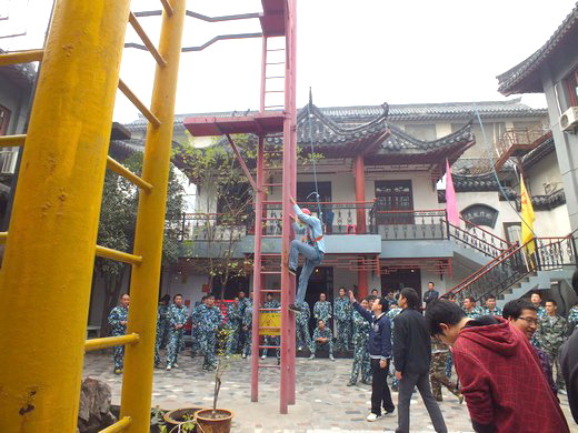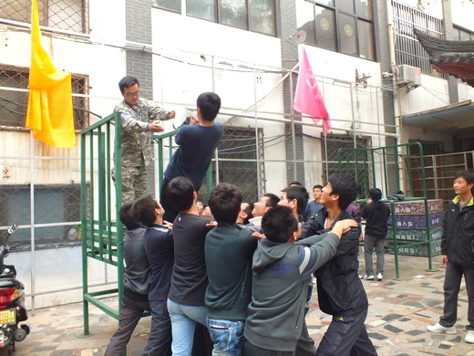 这次活动有三个环节。首先是开幕破冰,教官在发言以后,首先组织进行了几个体力小游戏,充分调动起学生们的情绪和活泼的活动气氛,接着将所有学生分成了两队,接下来的活动就在这两队竞争中展开。接着第二个环节是信任背摔,五对学生互相伸出手搭成一个台面,要接住从高台上背摔而下的同学。这个是锻炼信任协作的环节,能够让人充分体会信任和合作的重要性。最后进行的则是高空断桥――在佩戴好安全装置以后,学生要爬上四层楼高的高台,然后跳过一个断桥。这可以进一步提高学生的勇气和挑战意识。心理素质好的同学可以轻松通过,而心理素质不太好的同学也能小心翼翼地成功过桥,引来同学们的喝彩。