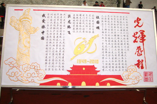 包子漫画 本期军训板报以“光辉历程”为主题,以巨龙幻化成“61”字样来表现共和国光辉六十一年,板报下方以祥云托起华表和天安门来表达安全学子希望祖国蒸蒸日上的美好祝福。板报整体选用红色和金色,版面整洁大方,设计新颖,给人以焕然一新的感觉。