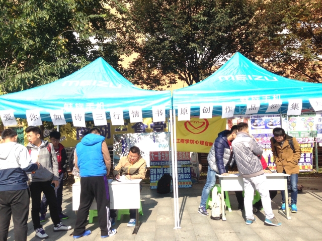 联合电力工程学院、矿业工程学院等学院的心理自助中心于各食堂广场举办三行情书活动。