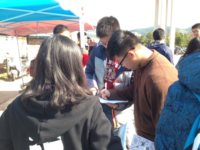 心理自助中心成员在三食堂广场进行活动现场报名宣传。一部分成员向同学们发放传单并介绍此活动,吸引来往同学的注意,同时也耐心的为咨询的同学讲解活动的参与方式。另一部分同学留在活动站点做好登记工作,同时进行数据的统计。现场气氛活跃,同学们共同努力维持现场秩序。13点30分,活动结束。