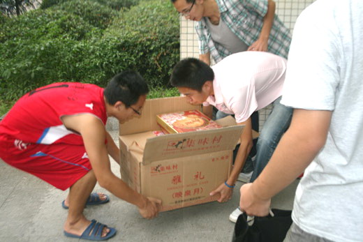 在梅三大厅为全院各班学生发放月饼。