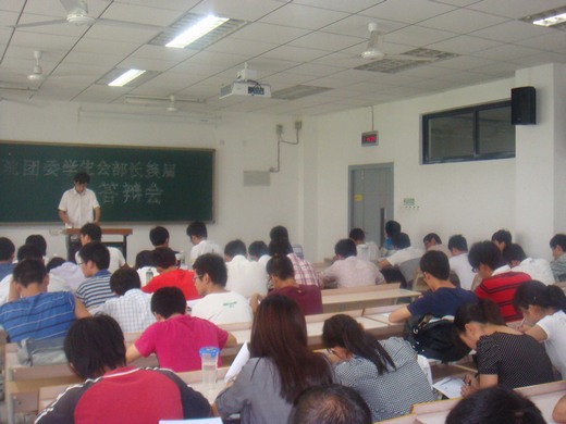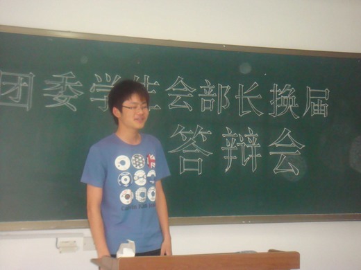 本次答辩会由团委副书记李念泽主持,根据竞选部门分下午和晚上场举行各个部门的竞选人员通过抽签决定答辩次序,每人有三分钟的自我陈述和两分钟的答辩时间。