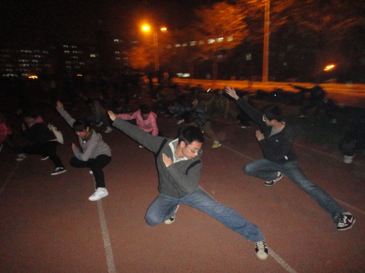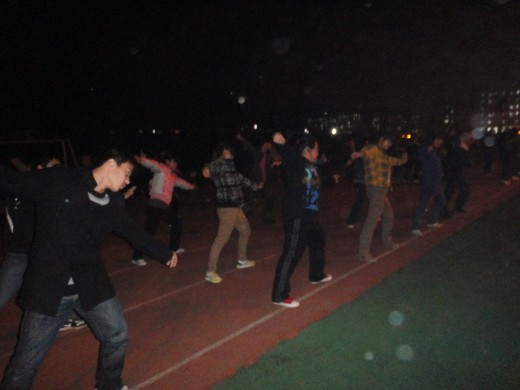 每晚8点50,同学们便在训练场地集合完毕,等待训练。9点整,训练正式开始。训练中,太极拳招式套路由10级的三位熟悉太极拳的同学负责教授,参加训练的同学在指挥下站成三个方队,分别在三位教练带领下,有秩序的进行太极拳训练。负责教练的同学在指导中认真负责,逐一对太极拳动作中的要点进行讲解,并细心指导每一位同学规范动作。虽然夜晚气温较低,但同学们都热情高涨,以最佳的状态投身到训练中去,认真学习每一个动作,规范做好每一个动作。一周来,参加训练的同学们都有了明显的进步。