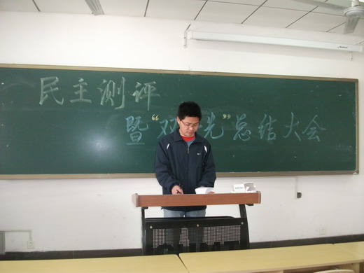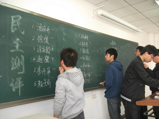 4月9日上午十点半,在教四C505安全09-4班举行了民主测评暨“双争先”总结大会。由班上的团支书主持了此次民主测评。首先由团支书介绍了一下民主测评的章程,然后按要求在黑板上列出了前20 名,然后开始民主投票。按得票的多少选出前十二评定等级为优秀,剩余为合格。然后再在此基础上民主评选优秀团员和优秀团干。整个过程严格按照学院要求,本着公平公正的原则,仔细统计了票数,然后将结果如实地记录了下来上报给学院。