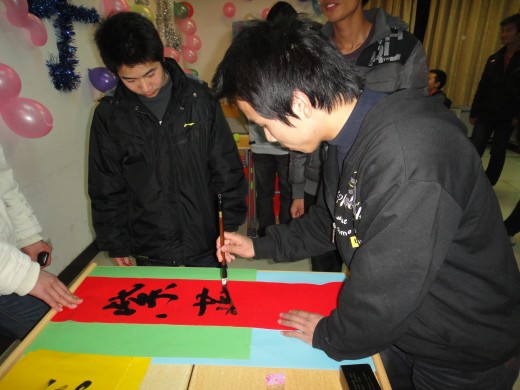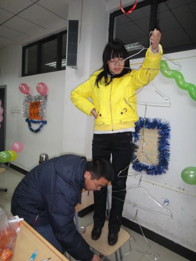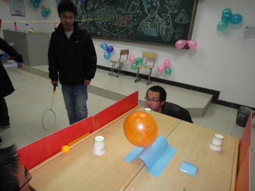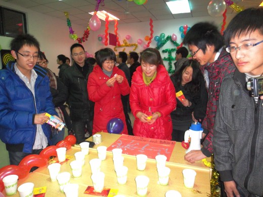 组织的游戏中,“游龙戏珠”人气指数非常高,该游戏要求选手用一根吸管将乒乓球吸起来,然后跨越三道由气球组成的屏障,再将球放入筐中。在走路过程中,还要回答一些简单而又刁钻的判断题,回答错误,立即回到起点重新开始,这些看似简单的问题让很多选手与奖券失之交臂。“让子弹飞”的小游戏也让大家玩的酣畅淋漓,参加游戏的选手用乒乓球砸桌面,反弹进入水杯中,水杯中随机放着电影《让子弹飞》中的一些幽默台词和奖券,如果乒乓球落进的水杯中装的是奖券,则选手拿走奖券,如果是台词,则要求选手手拿扩音器大声读出台词,这些幽默的台词加上大家搞怪的表情引来在场老师和同学的阵阵欢笑。在欢声笑语中,大家共迎2011年的到来。