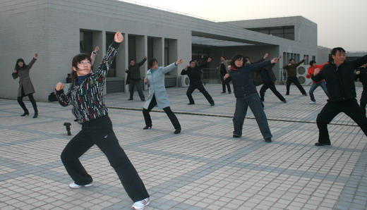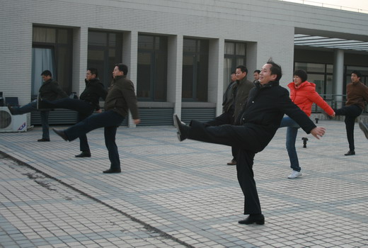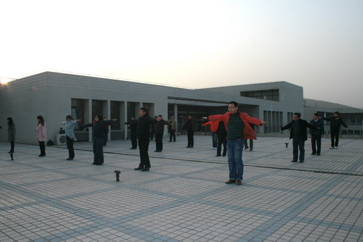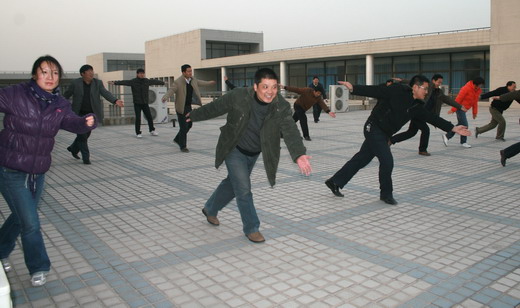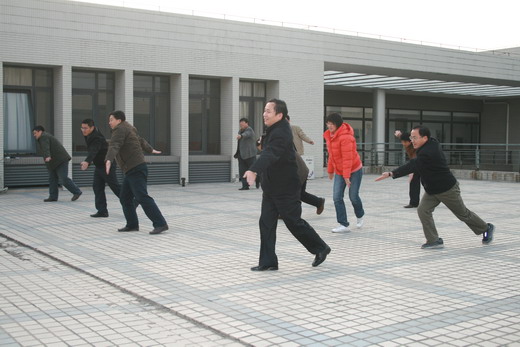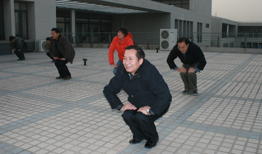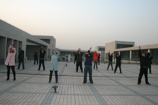 为在比赛中更好地展现学院风采,包子漫画 全体教职工坚持每天下午4:00在学院天台训练。包子漫画 王德明院长、章毛平书记、李金明副院长、钱雄副书记更是坚持每天必到,勤加训练,力求规范,起到了良好的带头示范作用。在学习广播体操中,全体参与的教职工都认真学习每个动作,为达到整体划一,既进行整体排练,又分排练习。练习过程中,教职工们个个劲头十足,态度认真,从预备节开始,踏步、举臂、抬头、踢腿、跳跃到最后整理运动的深呼吸,大家是每一个细节都不放过,每一个动作都力求完美,一招一式是有模有样,整齐划一。对个别学习动作上有难度的教工,教练员吴征艳老师认真予以纠正,进行个别辅导。全体教职工们在练习广播体操的过程中互帮互学,有时几个人给一个人看动作,作辅导,有时一个人给几个人喊操,大家在一起,有说有笑,如火如荼。