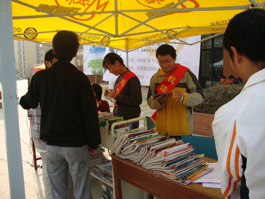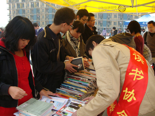 服务分队与“读书协会”成员一起到图书馆漂流区搬书,然后将书分往各个食堂广场,交给在那等待的队员。九点半,读书漂流活动正式开始,在活动中,工作人员向各位前来观看的同学介绍了读书漂流活动的目的方式,鼓励各位同学能积极捐书。很多同学都积极地参与进来,或捐书,或换书,或还书,积极性非常高涨。