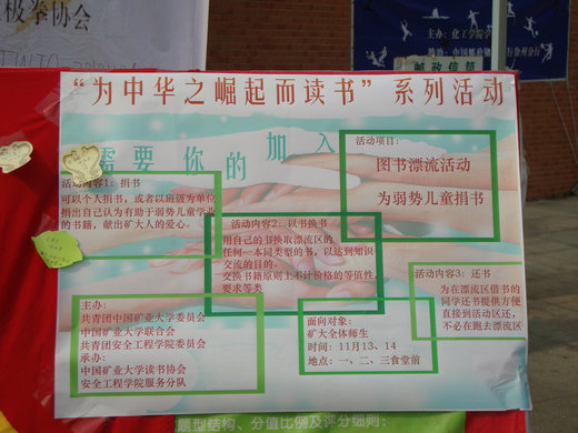 此次图书漂流活动以捐书、换书、还书为承载方式,面向全体矿大学生。同学们可以赠书给漂流区,同时也可以拿出自己的书籍兑换感兴趣的刊物,换回自己在图书馆漂流区借的书籍。读书协会将把所得书籍无偿捐献给贫困儿童,支持他们的学业。