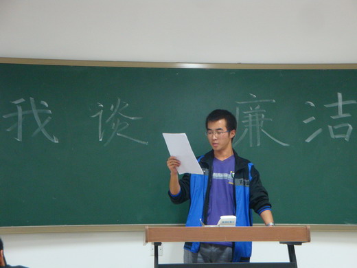 此次班会分为 “我谈廉洁”,“工作安排”,“同学交流”三部分。班委成员率先发言,他们纷纷发表了自己对廉洁的认知和想法。之后,同学们踊跃上台发言阐述自己对校园以及社会廉洁之风的看法,同时也表达了自己的廉洁之心:将廉洁之风进行到底。然后,班委成员对近期班级的学习、生活等进行了详细安排。在同学交流环节,同学们以幽默风趣的发言将整个班会推向了高潮,班级气氛积极融洽,展现出了团结和谐的班级风貌。